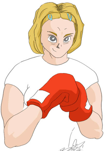 Boxer Elle: One of the few pictures i've actually drawn of females...hmm, sounds suspicious eh! Anyway, Elle reckons she looks asian in this pic. I don't take criticism too lightly, so i killed her. Apparently though she has a twin running around somewhere...