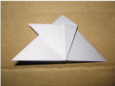 | 1. Do a waterbomb base | 2. Take one tip of one of the 4 flaps to the center of the paper (i.e. the top of the triangle) as if you were actually doing the water bomb. Unfold that step. |