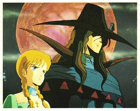 | Vampire Hunter D is japanimation set in the distant future. It begins with a girl getting bit by the powerful Count Magnus, a vampire. She meets D, a vampire hunter, who tell her the only way to cure her bite is to kill Count Magnus, who was thought to be dead. D somehow knows about about Magnus, as Magnus knows something about D. After all, D is half vampire. This anime is great and has some cool action scenes. I would definetly recommend it. |