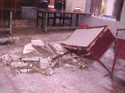 El escritorio de uno de los concejales fue aplastado por los pedazos de cielo raso. El pasado lunes, pocos minutos antes del inicio de una sesión de los concejales de Quibdó, se desplomó una gran porción del cielo raso de la edificación. Los materiales caídos destruyeron el escritorio de uno de los concejales. El local donde funciona el concejo de Quibdó fue una de las primeras edificaciones construidas en cemento en la capital chocoana en la década del veinte del siglo pasado y fue declarada patrimonio arquitectónico por el Ministerio de Cultura. Sin embargo su deterioro es total y su aspecto es ruinoso: goteras por todas partes, humedades, fisuras, problemas hidráulicos, sanitarios y eléctricos por doquier. Desde hace tres años los concejales han denunciado la lamentable situación del recinto, pidiendo al alcalde la realización de las reparaciones del caso, sin tener respuesta positiva hasta el momento. |