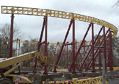 After years of building up pressure, Volcano announced its presence with a rumble in 1998 as the only coaster in the world to shoot you straight out of a raging volcano! Inverted below the yellow track, Volcano rolls out of the station around a small turn before the Linear Snycronist Motors (a slight variation to LIM's) kick in launching riders from zero to 74 miles per hour in a matter of seconds! Riders blast down a tunnel and encounter a heavily banked turn leading to a second set of LSMs. Speeding through a cavern inside the mountain, passengers blast straight out the top of the mountain! Once over the top of the loop out the top, a panoramic view of the park is offered before the first of 3 Heartline Spins, twisting either in or out of themselves until a final 80-foot dive finishes off the ride. From beginning to end, Volcano is a blast!