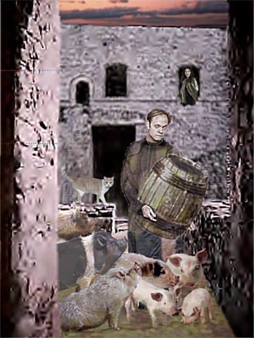 This is the most complicated composite I've done so far, with 20 sepreate layers (counting the airbrushing as one layer). You wouldn't beleive how impossible it was to find a picture of a peasant - or a pig! I ended up cutting out two textures and warping them around the figure to simulate sack cloth. This is a nice, depressing, gray picture in an environemnt about as far away from Niles's normal haunts as you can get.
