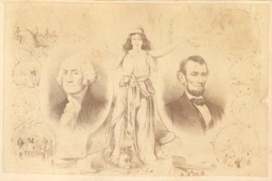 This image of Washington and Lincoln on either side of Lady Liberty and surrounded with drawings of their exploits is a rare find. Unfortunately it has faded so much that their exploits can't really be made out. What I see is Washington crossing the Delaware River, what I assume is the surrender of the British, and an image of freed slaves cheering their emancipator [but these are only guesses].