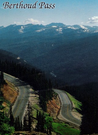 From the top of the Continental Divide, looking down the east side of Berthoud Pass. Imagine being at the spot where the Stanley snow slide occured in 2007? Looking down to the bottom of Hwy 40 coming into Berthoud Falls.