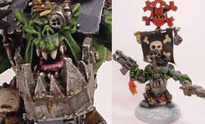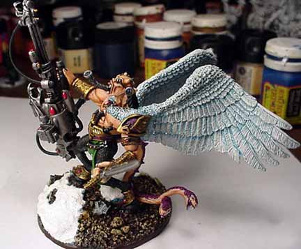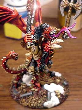 Ok, time for Quasi's game, "Spot the bitz". So here goes. Well the head is off of scyla a fantasy character, infact that is probably what makes up most of the body. The axe in his left hand is a demon prince axe, the other is a minotaur lord axe. and the wings are from either a cockatrice OR a bull taurus....But all together it makes for one mean guy who must be getting his share of skulls for the throne of khorne.