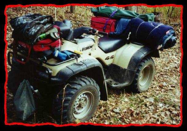 In the fall of 1999 my wife and I journeyed to a friends cabin to play paintball.The cabin was 7 miles from the main road.As you can see all paintball gear for 2 days play is possible to get onto a fourwheeler.What you cant see is the 20# co2 tank hanging off the back.