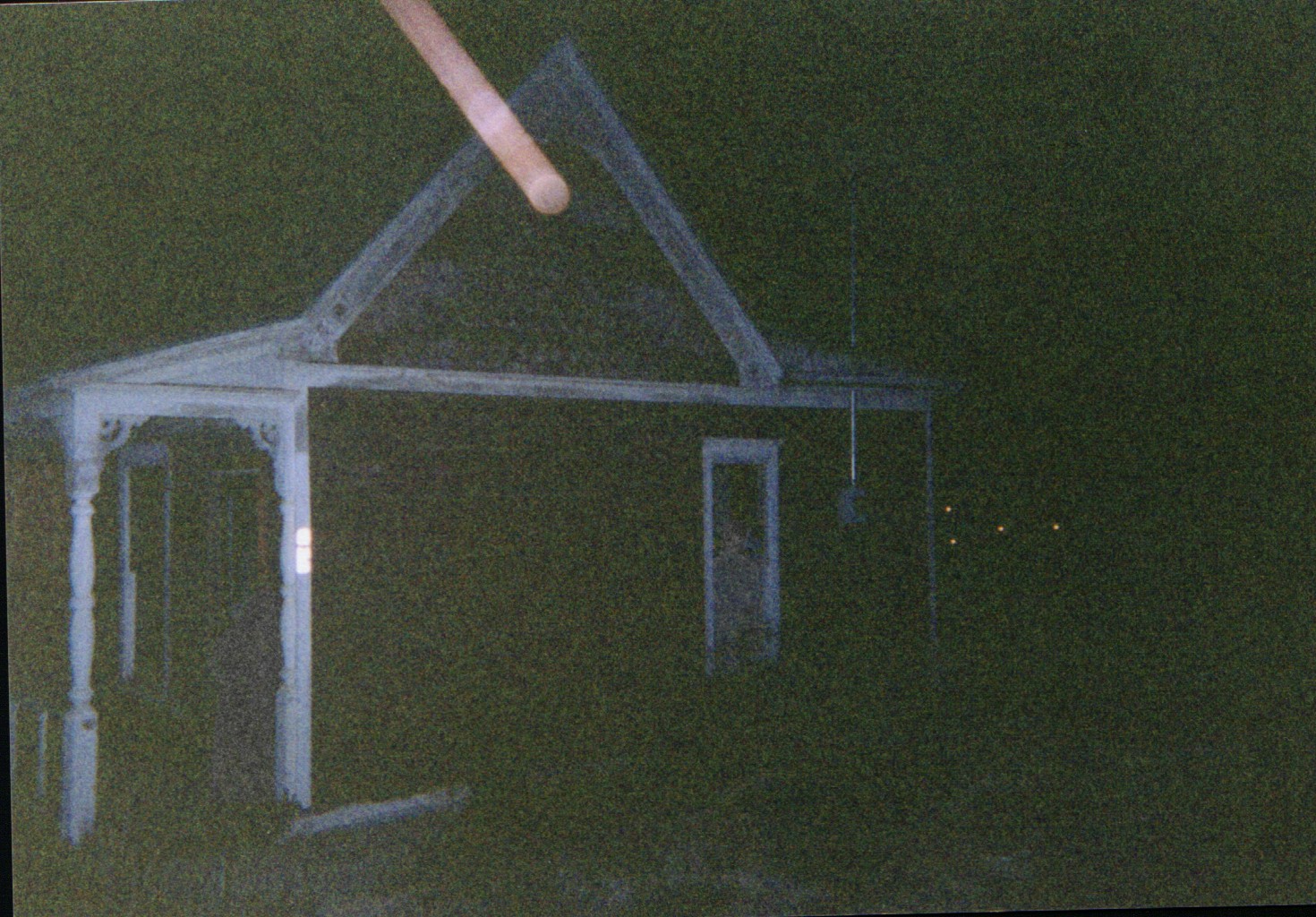 Well, after we took that picture, we turned back towards the car- and that's when we saw the "house." Upon laying eyes on it the first time, I knew that there was something very wrong about that building. It was infinitely scary, and one particular window on the DARK side of it was glowing. It was painted blood red, and the address of it was 238. I'll explain the significance of the address in due time... because none of us bothered to check it out the first time that we were there. All of us felt the "feeling" at the same time, and when we could finally talk we both began saying that it was definitely haunted. We went closer to it and the bad feeling kept getting worse. It was as though the house gave off some sort of energy that can't be explained- and for some reason we could feel it. Like I was saying, we went up to it and took a closer look. I just had to take a picture- I'm hoping that something turns up. I had D and B stand next to the white porch just to get an idea of the size of it (not too big) and after the picture was taken they both touched it. I have no idea why- but they did. D got a very pained expression on her face, and said that it was cold- and not a natural cold. She said that it felt like the cold off of dry ice, and it chilled her from head to toe. B said the same thing- and I was just too chicken to touch it myself.