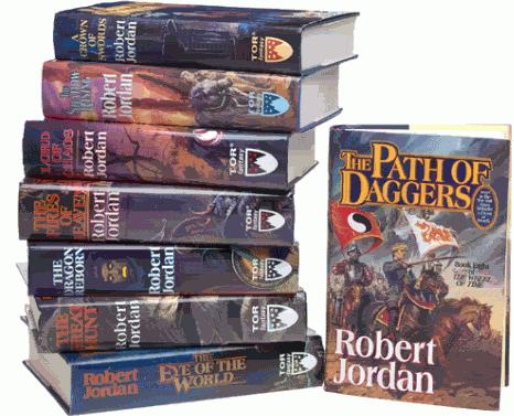 The Wheel of Time series by Robert Jordan has spanned eight thick books with a ninth one coming soon. I've been reading these since seventh grade and they've kept me hooked. The last book wasn't that great, though, because there was no big battle or earth-shaking event like in the previous books. Although the lastest one Path of Daggers isn't pictured here, this is the series from one to nine.