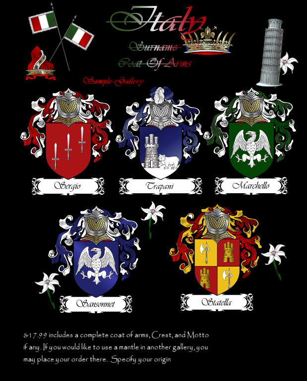 Order an Italian surname coat of arms for only $17.99. No surname list is ever complete please contact us if your name is not in the list