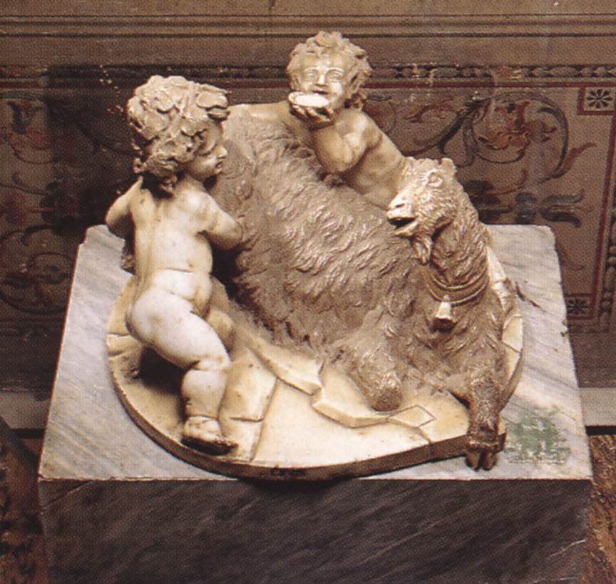 His mythological sculptures appear mainly in his early works of the 1620s. The first notable mythological piece to be mentioned is The Goat Amalthea with the Infant Jupiter and a Faun. It is one of his earliest surviving works. The marble was created in 1615 (though some claim 1609) and shows the divine goat Amalthea, who suckled Jupiter on Crete where he was born. To repay her for her kindness, Jupiter turns the goat's horns into magic Cornucopia, so that they are always filled with whatever the goat wishes. Here we see not only the goat and Jupiter, but a young faun as well to balance out the composition with each boy on either side of the goat, forming a stable triangle form with their heads. Though in its early stages of development, Bernini's special talent for portraying virtuosity and the life of his subject matter still shine though. The realistic quality of the goat's skin and the boys' hair have been pointed out the reoccur in Bernini's later works. (Wittkower, Catalogue). This late-antique realism is said to be a result of his study of Hellenistic sculpture in his youth (Hibbard, 26).