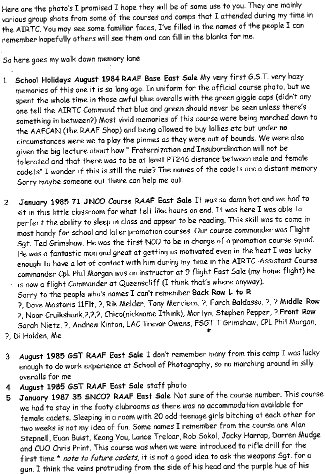 FYI In your SGT'S course photo the guy sitting on the viewers right hand side of the course commander is Glenn Harrap from 9Flight East Sale who later went on to become a WOFF. His mother is now the current flight commander at what is now known as 409 Squadron East Sale.