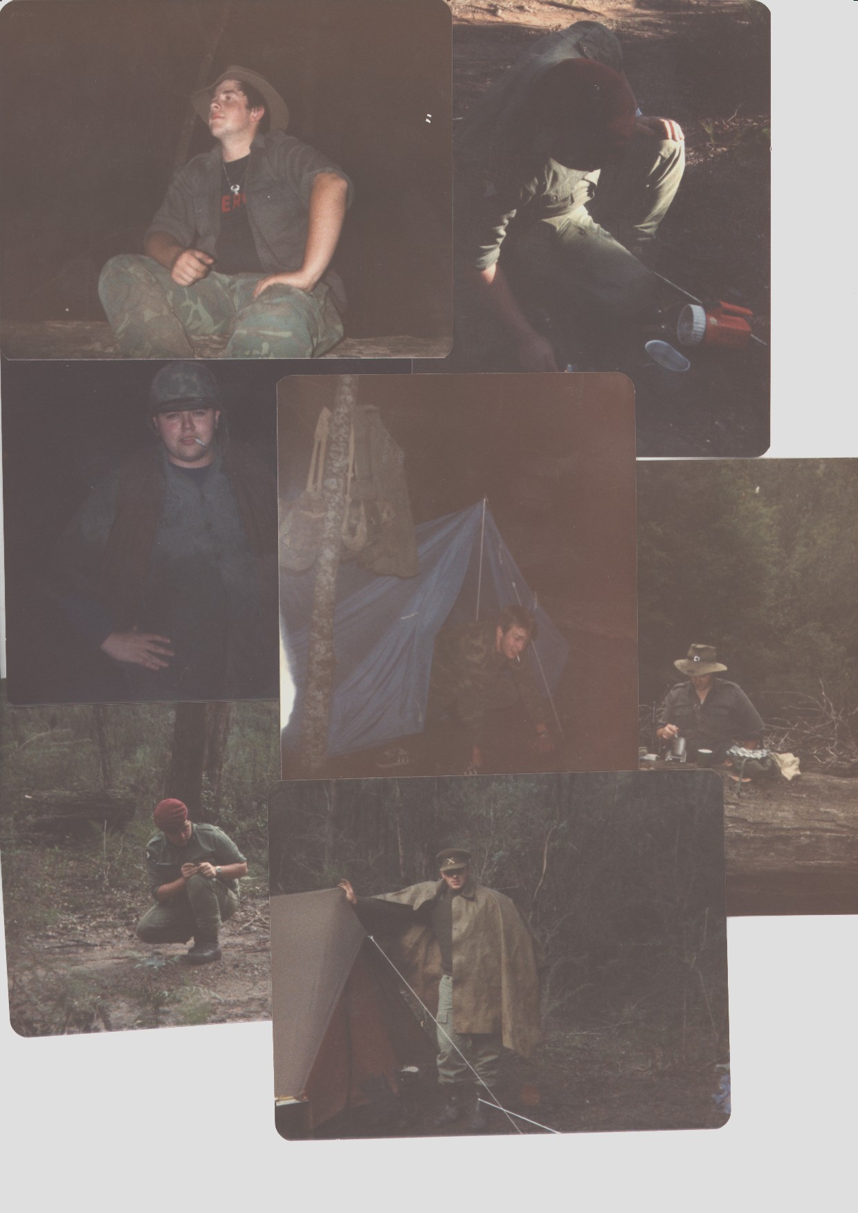 Bottom Right... a very enthusiastic bivouac "wanna be" only prob is that those spit polish boots will reflect the glare and eventually give away his position.WE LIVE AND LEARN.