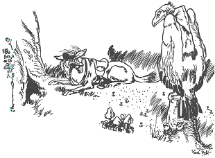 While he was lying there, Mr. Buzzard came flapping along, and seeing Brer Fox stretched out on the ground, he lit nearby. Mr. Buzzard shook his wings, put his head on one side, and murmured to himself, "Brer Fox is dead, and I'm so sorry."