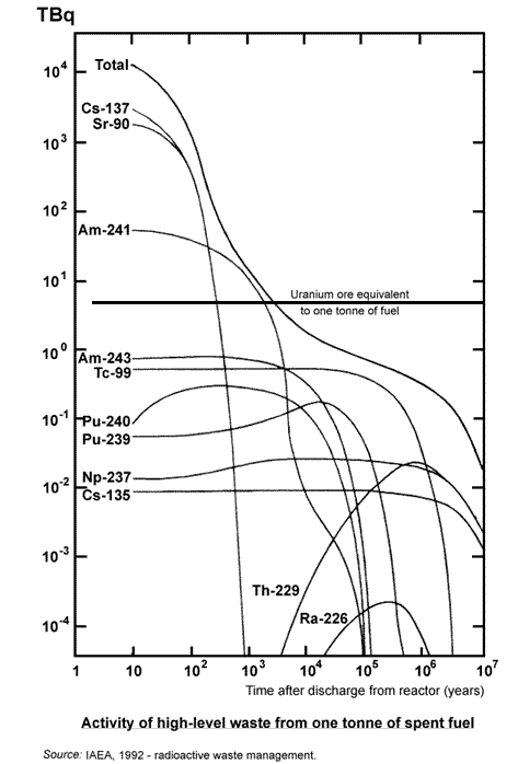 The main transuranic constituents of spent fuel are isotopes of plutonium, neptunium and americium. These are alpha-emitters and have long half-lives, decaying on a similar time scale to the uranium isotopes. They are the reason that spent fuel needs secure disposal beyond the few thousand years or so which might be necessary for the decay of fission products alone.