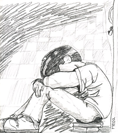 I have to apologize for the shittiness of the quality of this one. Pencil doesn't scan too well with my scanner, but you get the idea. This started out as yet another quick sketch, but ended up turning into a three-hour project. This sort of sums up how I felt in grade 6. Yep, that's right. It's an artistic angst drawing.
