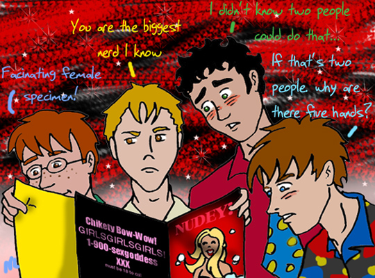 Boys will be boys.... Don't know why I drew this either, except I thought it would be funny. Needless to say, the magazine is Adams...and I don't think the other guys have ever seen anything quite like it before. (Colin!Cover your eyes young man, you're not old enough to see stuff like that! Maybe when you turn 30 you'll be old enough!) ;)