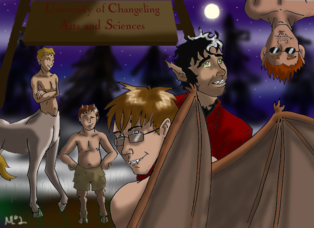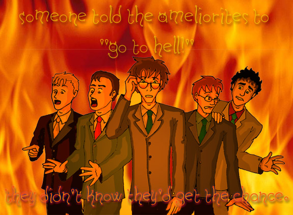 I had a dream a few months ago...and it has been the only dream I remember in which my characters were in it. However...they were not in a band...(or maybe they were, I dont know...) they were like...enrolled in a monster university because each of them could change into a certain monster or..mythical creature or whatever. I was in the dream too, so that was kinda cool. I was in the co-ed dorm with these guys, and the dorm was just an old house...gone college style. And the campus looked a lot like my campus except it was in the middle of the woods away from society. (gee, wonder why?) Hehehe, I liked that dream because I made friends with Colin. >big grin< Anyhoo...I had to strain myself to remember what everyone's monster power was. Colin I remember because I hung out with him in my dream. He was a werewolf...but when he changed he wasnt nasty, just his sweet self in a canine-ish form. I could remember that Garrett had wings...and then I remembered he was a vampire of sorts...and so was Gavin...but they were different. Gavin was the typical vampire who could turn into a bat...Garrett was a radical vampire because he couldnt turn into a bat...but he had bat-wings. Very very weird... Um...ok, the last 2 I messed around with for visual/humour sake. In my dream ADAM was the faun...and...well..Javier I couldnt remember. But When I got to thinking about it I realized Javier would make the better faun. He's got the gut for the part. At 1st the idea of Adam as the centaur threw me off...but then i realized he could have some very crude pick up lines if he had the body of a horse. Very rude. Let's just say he's not very popular with the ladies on campus because he's so crude. (come on, do I have to spell it out for you? Horse?? What do they say about horses? Guys specially...????) Jeez. I i am a WRONG lil girl... Anyway...I think I know why I had this dream now... I think my friend Pat was telling me about his monster/vampire porn novels he's reading. (they're not really porn, they're just really smutty) Anyway...I'm gonna shutup now...