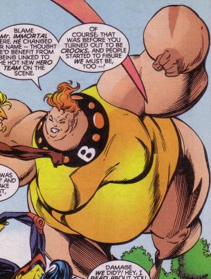 Body Transformation (Self): Am ability to transform her body, causing herself to become immensely strong (by increasing the density of her muscle tissues) and massively obese. (She weighs in at over 1,100 pounds when at full expansion.) While in this transformed state, she has the following abilities: