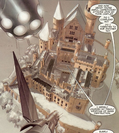 Doctor Doom is headquartered in Castle Doom, a huge 110 room castle built in the 16th Century by the Latverian nobleman Count Sabbat. The castle overlooks the Latverian capital of Doomstadt (formerly Haasenstadt). Taking occupancy soon after usurping the throne from King Vladimir, Doom has dwelled in the castle ever since, with the excepion of a brief period of time when the usurper Prince Zorba reigned.