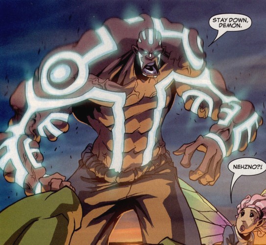Extreme Strength: Gentle has the ability to temporarily increase the muscle mass of his body to impossible levels, giving him Un Strength and Endurance (Health changes). He achieves this by energizing the markings adorning his body. He cannot sustain this form for long however, as it causes massive strain on his body. When coming out of this form, Gentle must make a Red Endurance FEAT vs. unconsciousness for 1-10 rounds
