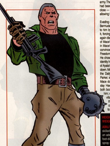 Mace: In material, Gideon Mace's right hand has been replaced by a foot-diameter mace that gives him the following power stunts: