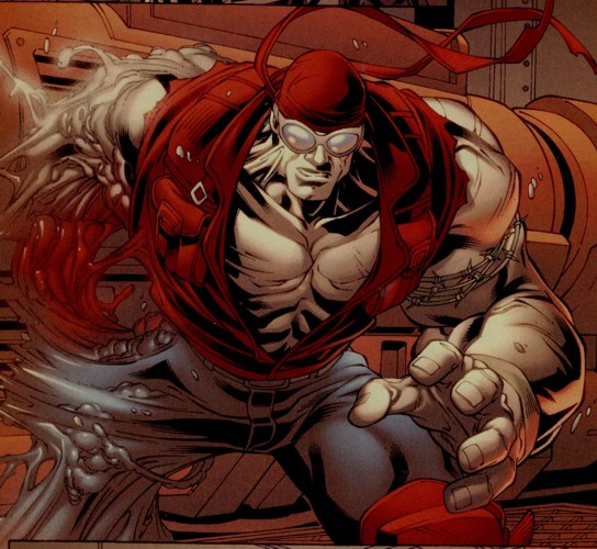 -Protoplasmic Projectiles: Random can transform his forearms into guns that fire hardened protoplasm that appears to be extracted from his own cells/bio-matter. These projectiles do Rm Shooting up to 5 areas away, and cost Random 5 Health every time they are used. He can regain these through his healing powers.