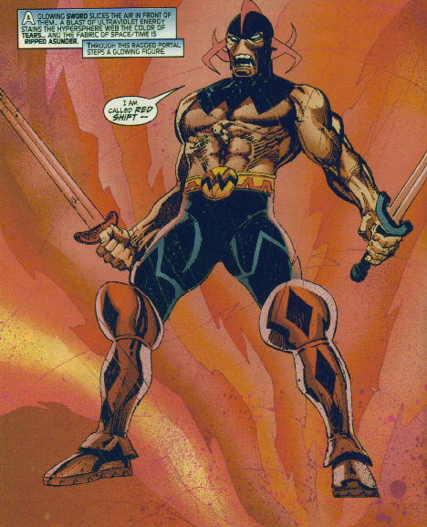 -Space Manipulation: Red Shift may warp space or shrink space, expand it and wrap it around himself with Am ability. Red Shift has the following power stunts: