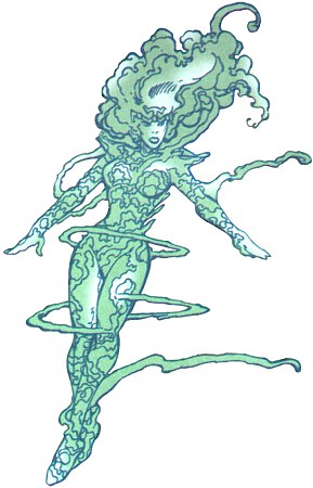 Gaseous Form: Tempest's body is completely composed of gases, without any solid (or even liquid) components above the microscopic level. It is a coherent cloud that retains its integrity even in the face of Un Intensity winds. Tempest can more at will in any direction and even penetrate liquids and permeable solids. However, she cannot freely move in a vacuum. Tempest would be immobilized if converted to liquid or solid forms but would take no damage from this act. Tempest can freely expand or contract, minimum size is one cubic foot, maximum size can fill a volume equivalent to the average shopping mall. Inhaling Tempest can be a fatal act since her gases can prevent required gases from reaching the lungs. She possesses a natural form of Phasing that permits them to penetrate solids.