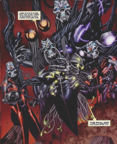 Recently the Phalanx have entered Kree space and have taken control of Hala the Kree homeworld. From there they surrounded Kree's space sector with an indestructable force field, allowing no one to either enter or escape. The Phalanx infiltrated the Kree using the Spaceknights whom were under their control. From there they have infected numerous beings of immense power such as the Super-Adaptoid, Gamora, and Ronan.