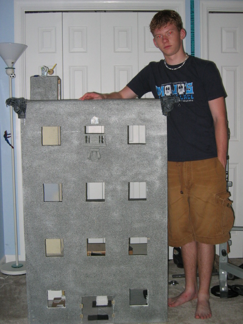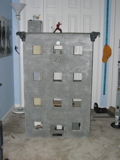 This is made of wood, painted with Speckle paint. The gargoyles are from the Spider-man Movie Spider-man figure. The terrace is from Spider-man Movie Mary Jane. It has plexiglass doors and a partially finished interior on the first floor. It also has an elevator that can be cranked up by hand.