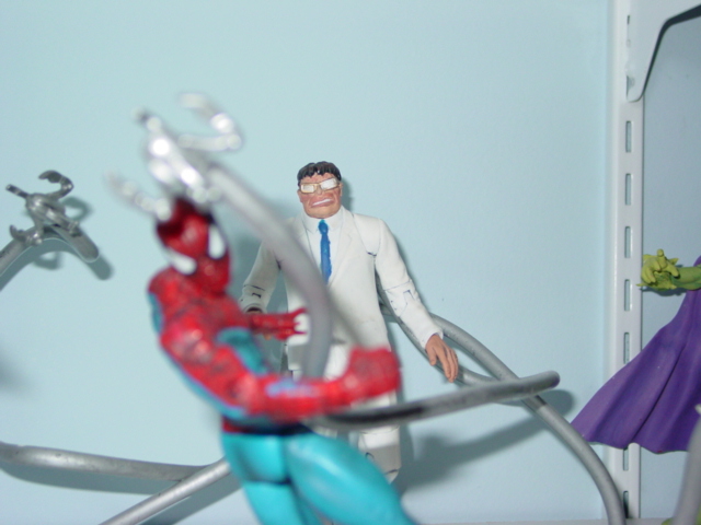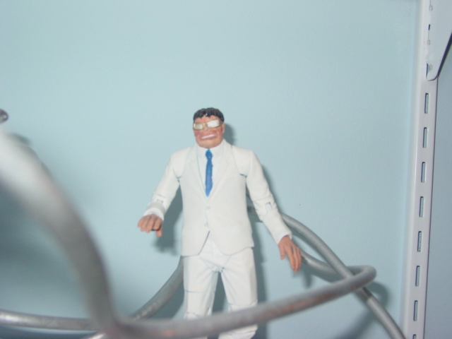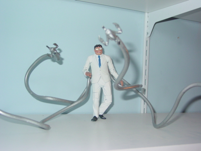 Doc Ock is made from a recipe by Rob Lowe, of Lowes Customs. He is a resevoir dogs mr. white, with the head of spider powers Doc Ock. the tentacles are made from rubber tubing with wires inside, drilled into Dco Ock's back. The ends of the tentacles came from the same figure that supplied the head.