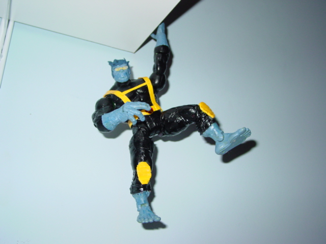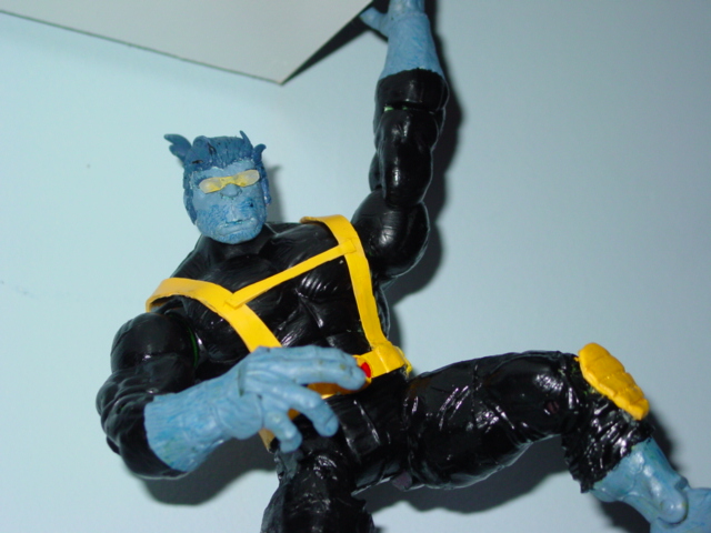 ultimate Beast is from two different Hulk figures. His head, with sculpted hair, legs and his hands are from Marvel Legends Hulk. His arms, hips and torso are from a Hulk movie super poseable leaping hulk, or something of the like. The suspenders and knee pads are poured casting latex, which was dyed with paint before casting. His belt is sculpy and the glasses are cut vinyl with paint smudged on. The hair on his face, arms and legs was made with a fine-tip blue marker.