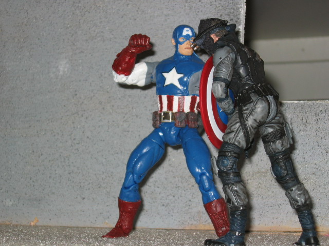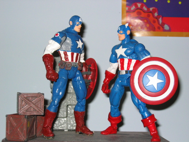 Ultimate Cap is made from a Marvel Legends Captain America, mostly. I first extended his torso bay about a half inch and then I sculpted an entirely new torso over top of it with sculpy. the detail on the head is sculpy as are the glove tops and boot tops. The hands are from the Diamond Select WW2 Cap, as are the pouches and canteen on his belt. The boots are from a Lord Of The Rings Faramir figure, with the tread from a Spawn Al Simmons figure glued to the bottoms. The shield is of course from ML Cap, but I coated it with Testors Glosscoat to make it shiny. The rest is up to the paint.