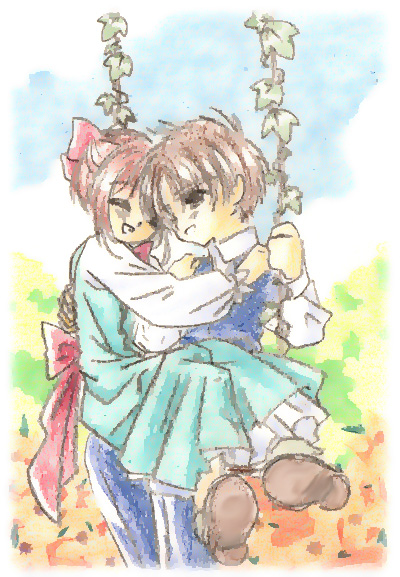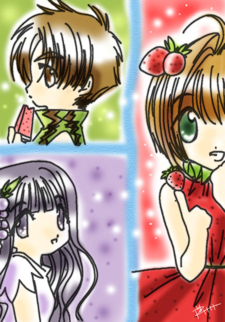 Shows the gang lying down on the soft grass. ^-^ Since Sakura's birthday's on April Fool, I did a mix version. ^-^A series of photos with Syaoran saying "o-e-a-i-o" (One of the lyrics in Leon Lai's song) ^_^ Swinging in the Garden: At least that was what I tried to draw. Wanted it to look a little old fashion. t seems that a lot of people liked this...^_^U Tomoyo in fantasy land. Kotori from "X", tried to make her clothes look like kimono. -_-'