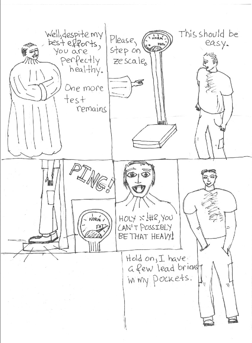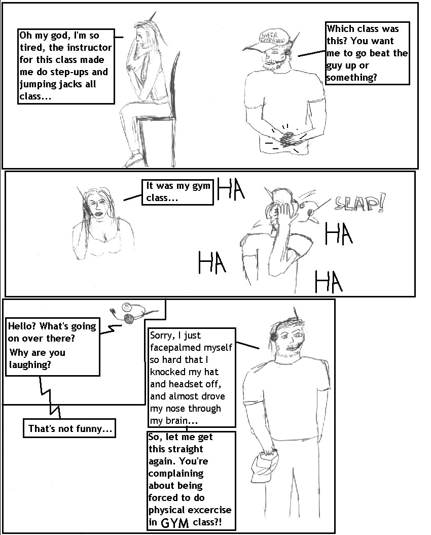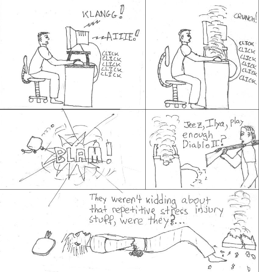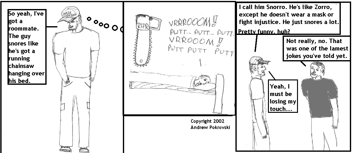 Nose Through Brain strip is mostly true, give or take about 33%. Hey, at least it's better than getting shafted by one of UMass' many academic/administrative departments. ;) Also, I have the second version of the "Not Funny" strip up. Contains a slightly better punchline. In my opinion, anyway.