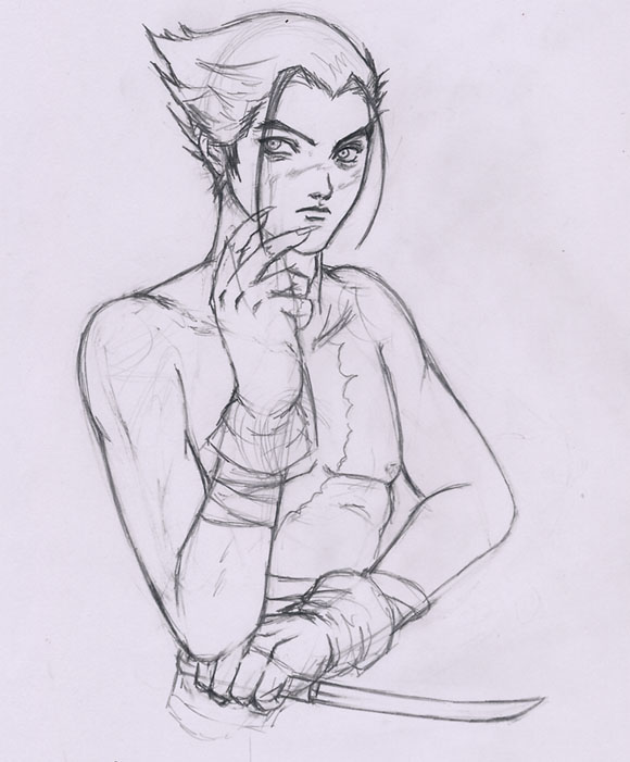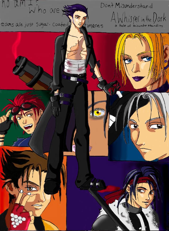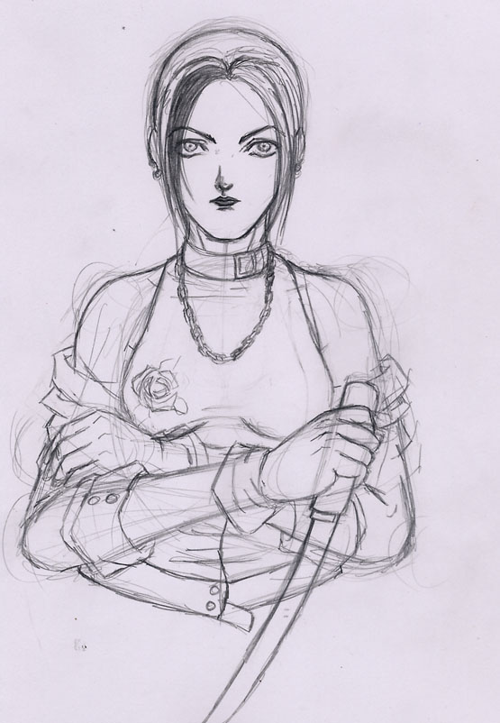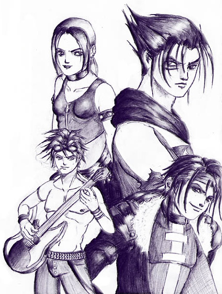 | A pencil sketch, made into coloured pencil courtesy of Photoshop! A shirtless Hwoarang plays the guitar, with A smirking Nina, somber Jin, and a cunning Hayato in the background. | |