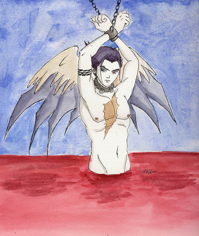 | A piece I am most proud of at the moment(5/8/02). Kazuya is depicted as a fallen angel held in bondage in his Hell; a Hell of blood that he is accused of having spilled during his previous life. Watercolour. | |