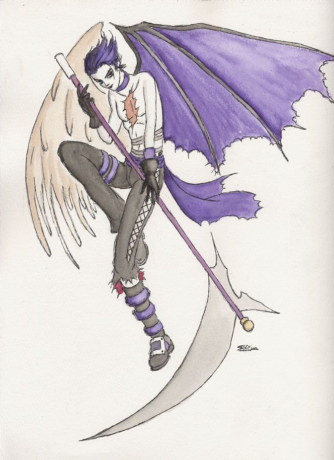 | For this piece, I decided to base the drawing style on that of the legendary Yoshitaka Amano. Kazuya is Death in this visage...the angel wing and devil wing represent my belief that Death knows neither Good nor Evil. Watercolour. | |