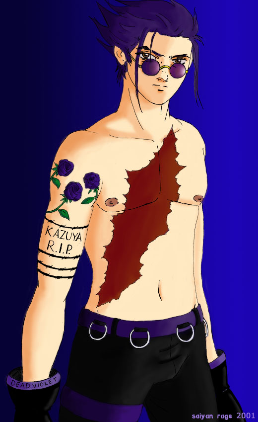 | One of the first CGs I was actually impressed with. Kazuya wearing sunglasses, bearing a tattoo that reads "Kazuya R.I.P.". Notice the bondage belt! ^_^ | |