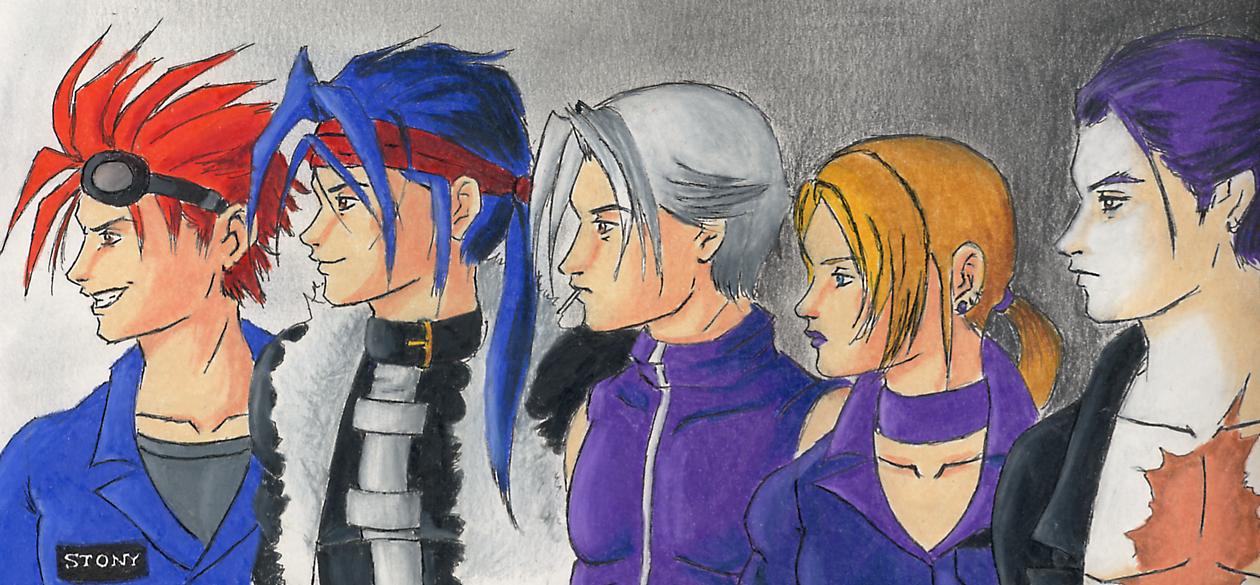 | A group picture, comprised in Prismacolour pencils and sketching pencils. From R-L: Kazuya, Nina, Lee, Hayato, and Hwoarang--in a "STONY" shirt, no less. | |