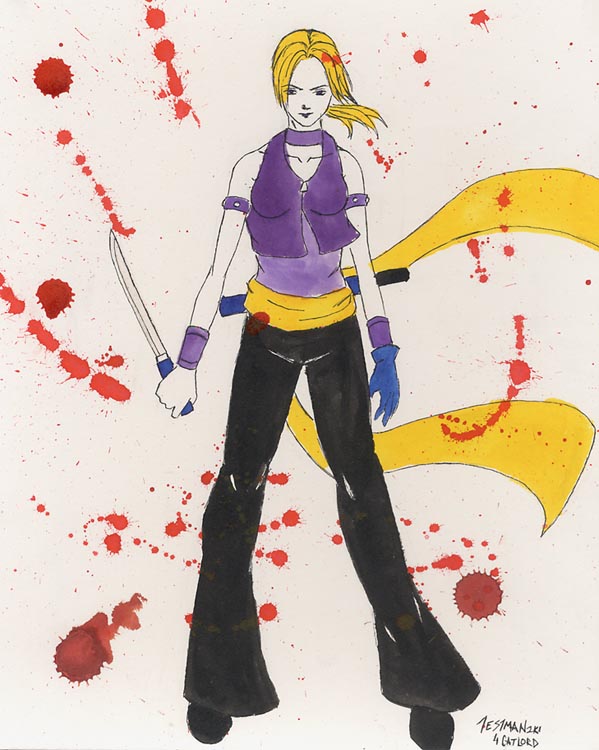 | bloody image of Nina Williams that I drew for Catlord for his birthday (which I will still send, I swear, Cat!). I had a lot of fun splattering the "blood", which is actually red ink. The entire image is coloured in Ink, and not watercolour. | |