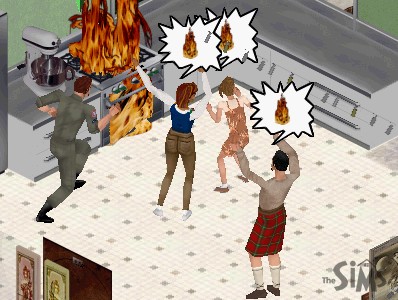 Okay, who's letting Terry cook? He's started a fire, and the family and friends are in a tizzy. "FIRE!" screams Pat, Tree and Olivia. "I'll save you!" Terry cries, rushing to the extinguisher. |