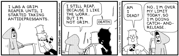 Earlier in the week, Dilbert was told that he was going to die. After a week of stress, the Grim Reaper finailly arrives. To Dilbert's surprise, the Grim Reaper is not as depressing as he had thought.