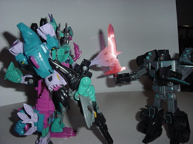 *Piranacon approaches. Battle Convoy clashes with him in a sword battle while Onslaught provides cover fire.*