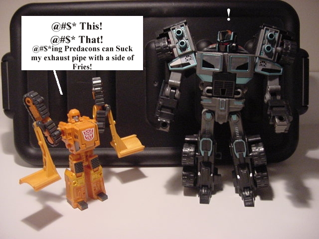 *Battle Convoy gestures to Onslaught and Deadeye to check behind the Cargo crates where the voices came from...*