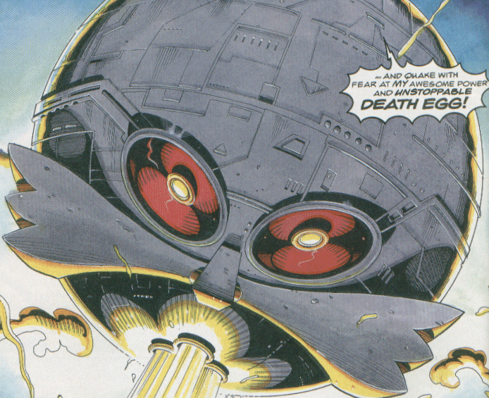 After a long struggle to get it flying, involving the destruction of one of the main thrusters, interference from Sonic and Knuckles and the destruction of his Mecha Metallix, Robotnik finally laid claim to the Master Emerald and used it to power his Death Egg and launch his vengeance on Mobius. However, Knuckles powered up the Floating Island and attacked the Satellite from the outside whilst Sonic stole the Master Emerald from within. Without its power source, the Death Egg plummeted from the sky and was finally destroyed.