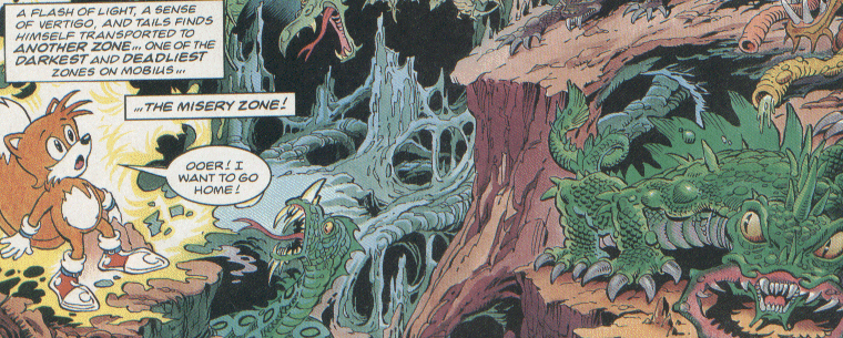 Bios: One of the darkest and deadliest Zones of Mobius, inhabited by fearsome creatures and demons. Tails was transported here by the Mysterious Traveller in exchange for the Unbeatable Foe, who eventually destroyed the Misery Zone with its apocalypse blast. The wasteland that was left over following this destructive blast proved suitably reclusive for Commander Brutus’s private base of operations, where he launched his revolution against Robotnik.