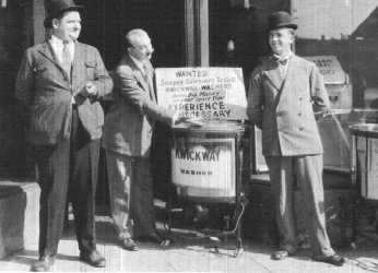 The Boys pick themselves up and replace their hats. They have on the wrong hats. A close up of the sign the Manager put up reads "Wanted - Two Dishwashers".