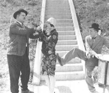 You guessed it : She points to the top of the steps, and begins to climb them. Stan kicks her derriere. She comes down a step and punches Ollie on the nose. It knocks his hat off. She lunges for Stan and knocks his hat off too. Ollie says