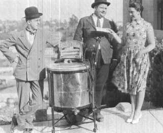 Anita walks away. Stan and Ollie look at each other and then turn to look down the steps. They take a deep breath, pick up the machine, and start back down the steps with it.